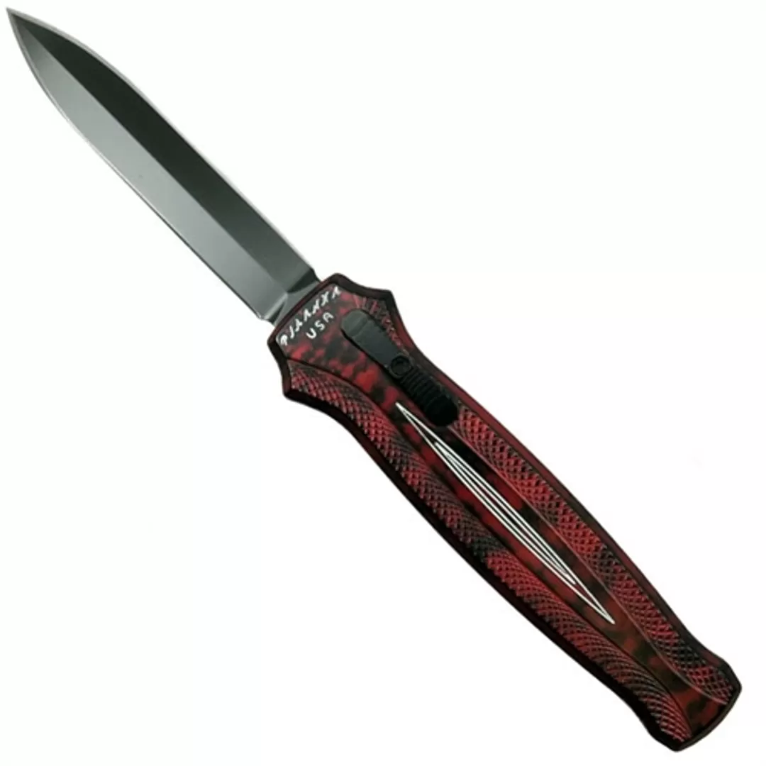 Piranha knives have certainly made their mark in the automatic knives arena for their tight tolerances, consistent quality and competitive pricing. Thanks to their unique custom-like anodized handle colors and a multitude of knife models with their respective blade variations, Piranha can most certainly appeal to every knife user. All models feature all-stainless steel hardware in addition to a titanium pocket clip. The Rated-X, which is Piranha’s double-edged version of the Rated-R, showcases aircraft grade aluminum handle scales that have been chamfered and rounded as well as feature a bidirectional texturing for a comfortable and secure feel. The handle scale boasts dual finger grooves on either side and the slide trigger has been placed off-center on the broad side of the handle for maximum control. This model, the P-20RT, features a marbled red handle, a dagger style blade in a black finish and the pocket clip is statically designed for tip down carry only on the traditional side of the handle. Made in the USA.