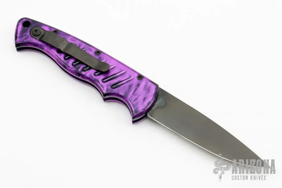 The Pocket by Piranha Knives features a black drop point blade with Plum splash finish aircraft aluminum handle. tip up black stainless steel clip. Comes with original box and papers. Excellent condition.