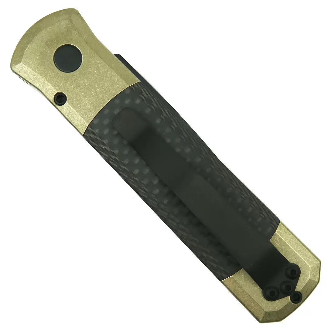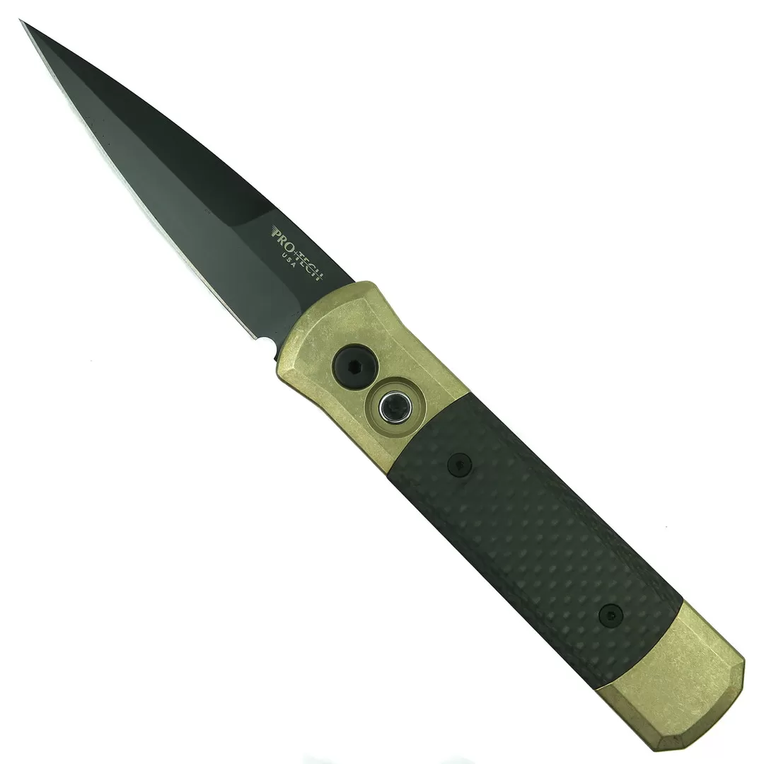 The Pro-Tech Godson automatic knife, model 7115, features a solid bronze aluminum handle with carbon fiber inlays coupled with a spear point blade in a black finish and the pocket clip is designed for tip up carry only.