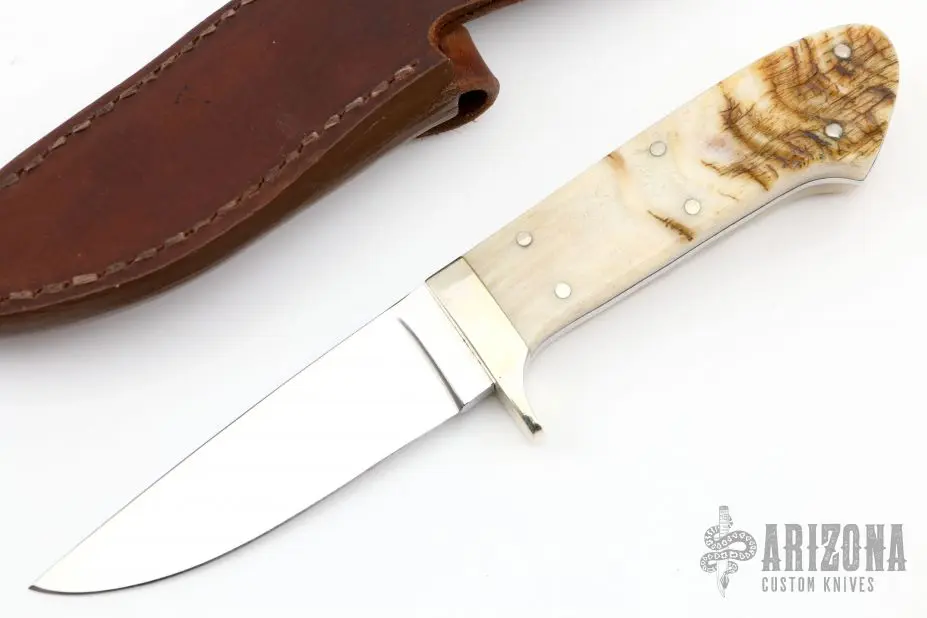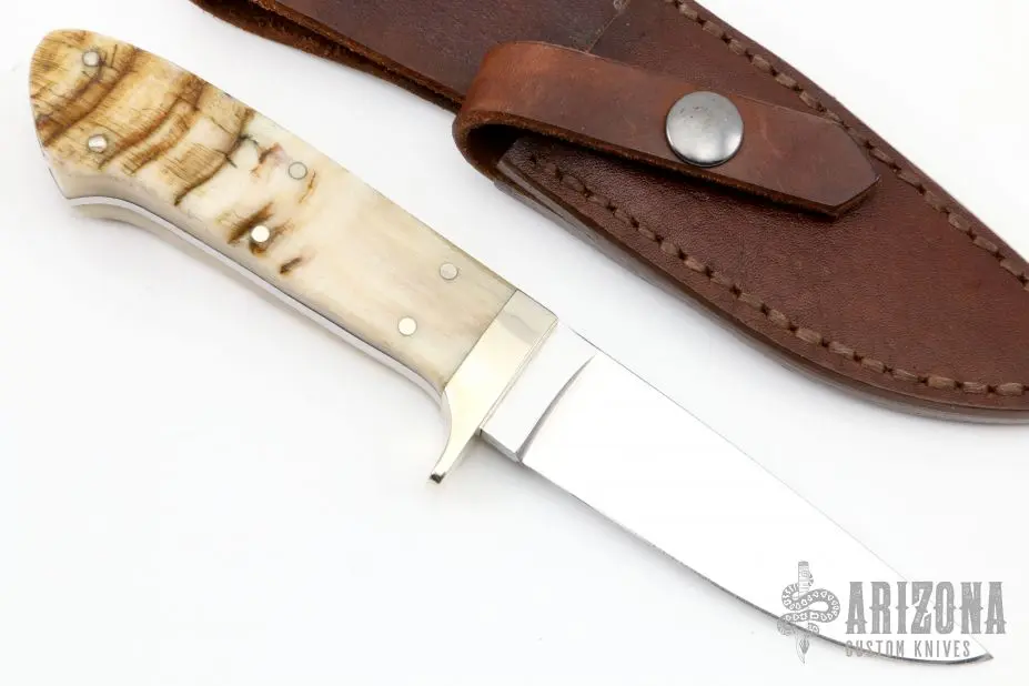 This knife by Jim Ort features a mirror polished drop point blade with a tapered tang construction. Â .209″ Blade Stock. Â 1.054″ Blade Depth. Â The handle features a nickel silver guard with rams horn scales. Â Includes a brown leather sheath. Â There is a little patina on the guard otherwise the knife is in excellent Condition. Â