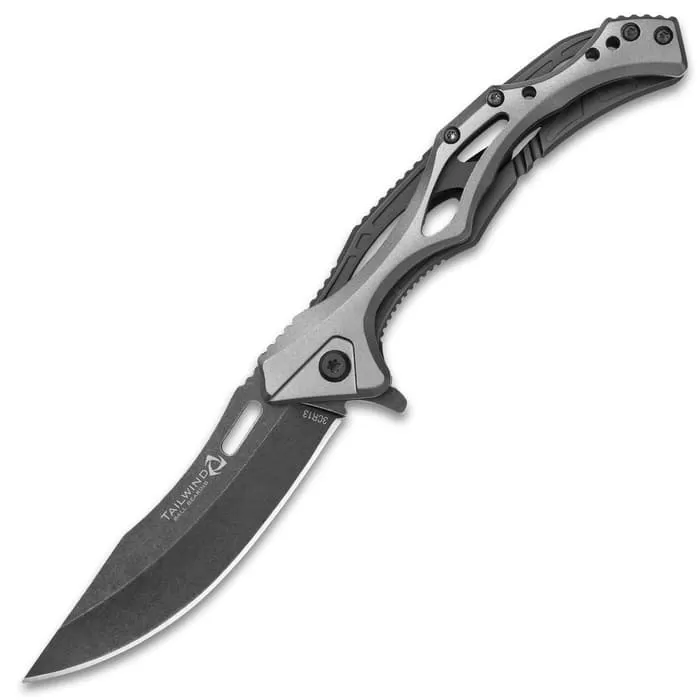 The Rampage Tailwind Ball Bearing Pocket Knife has an aerodynamic inspired design that is not only visually appealing but comfortable in the hand. It has a razor-sharp, 3 1/2” stainless steel upswept blade with a stonewash finish and a flipper to activate the ball bearing opening. The gunmetal grey handle is crafted of aluminum and steel, giving it a lightweight feel with an ergonomic grip. The pocket knife is only 3.10 oz, making it one of the lightest knives on the planet! The 8” overall pocket knife is 4 3/4”, when closed, and has a sturdy, black stainless steel pocket clip for ease of carry.