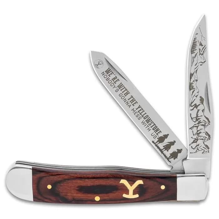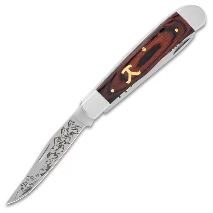 Our Ranch Hand Trapper Pocket Knife makes a handsome addition to your collection. Each of the two razor-sharp blades has laser-etched artwork that includes running horses and mountains and a positive statement. The brown wooden handle has an inset brass “Y brand”, accented by the brass pins and complemented by the polished stainless steel bolsters.