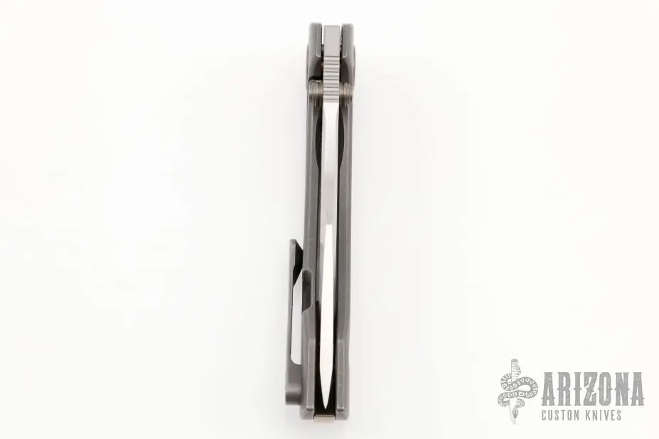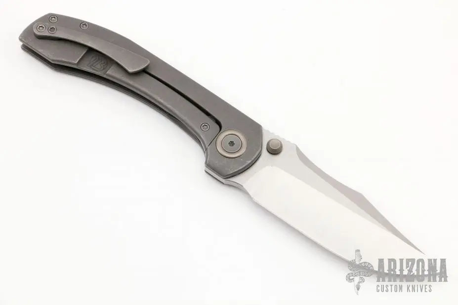 This Raptor by Brian Brown features a satin finish clip point style blade with dual thumbstuds. The handle has a titanium frame with anodize finish pivot collars, tip up clip and backspacer. Comes with a zippered case and COA. Excellent condition.