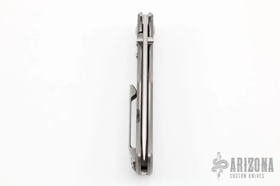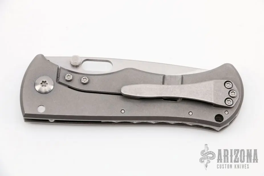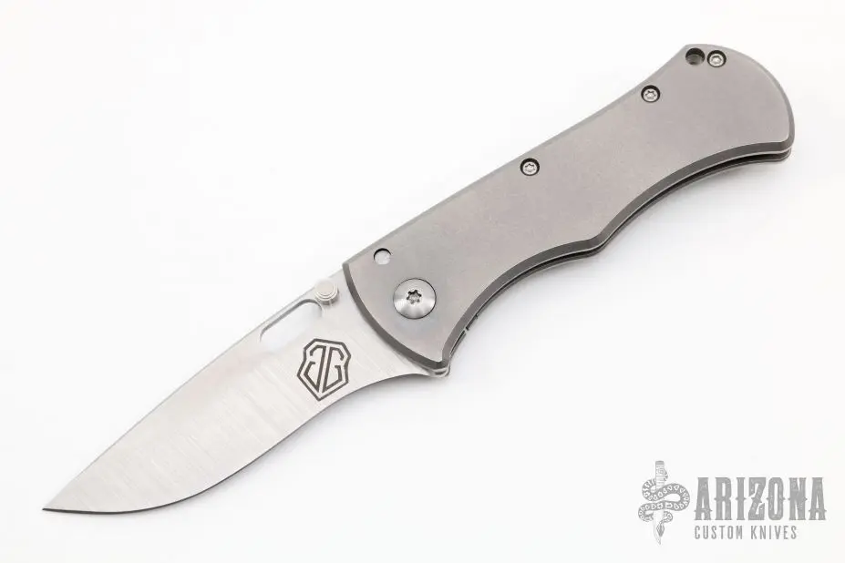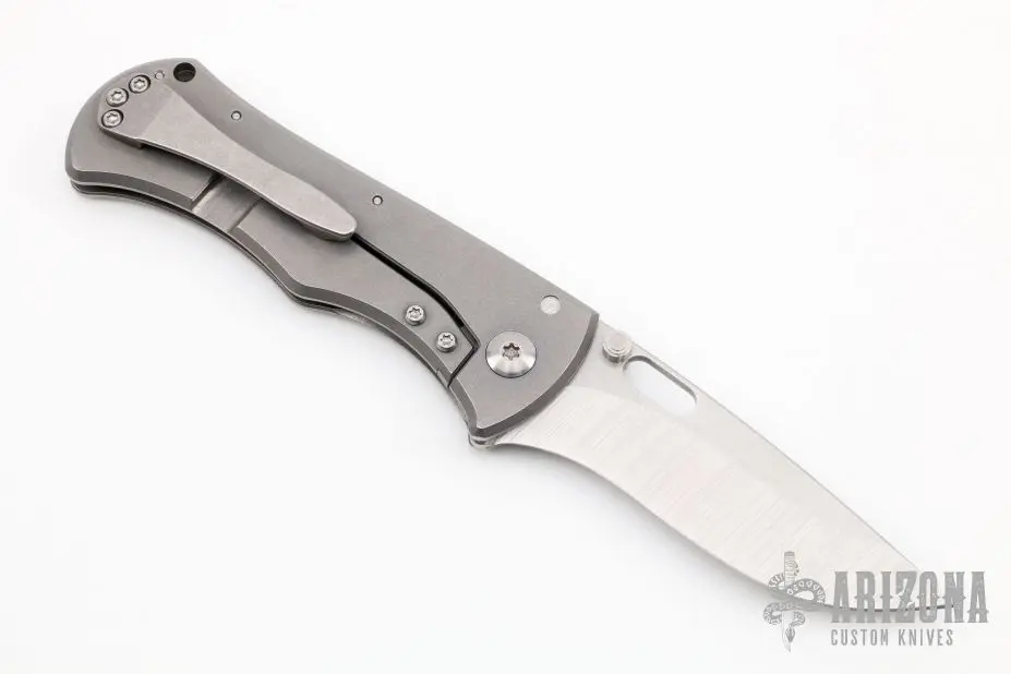 This Rostrum by John Gray features a satin/stonewash finished Magnacut blade with thumbstuds and thumbhole. The handle has a tumble finished titanium frame with a textured titanium backspacer and tip up stonewashed titanium clip. Has a stainless steel lockface insert and overtravel stop. Nice detent, lockup and blade seating. New from maker at the 2022 NCKS.