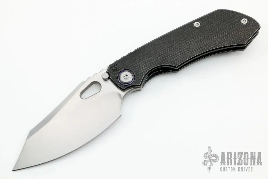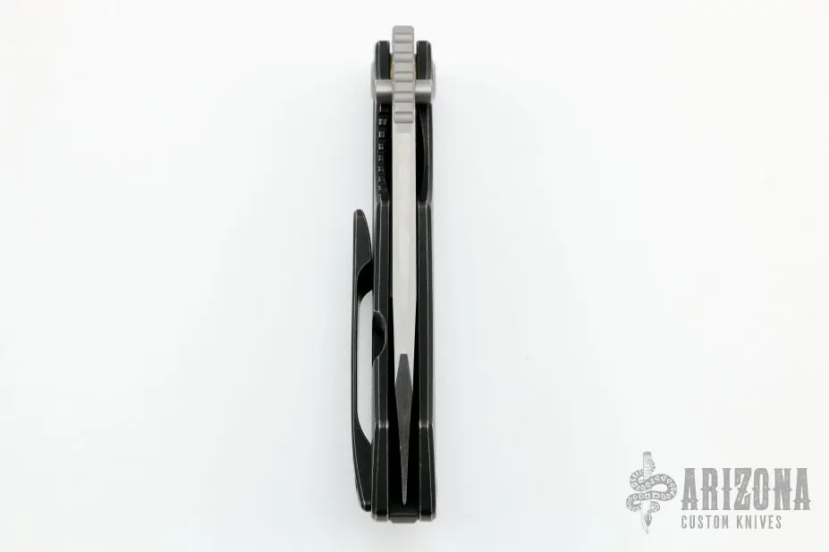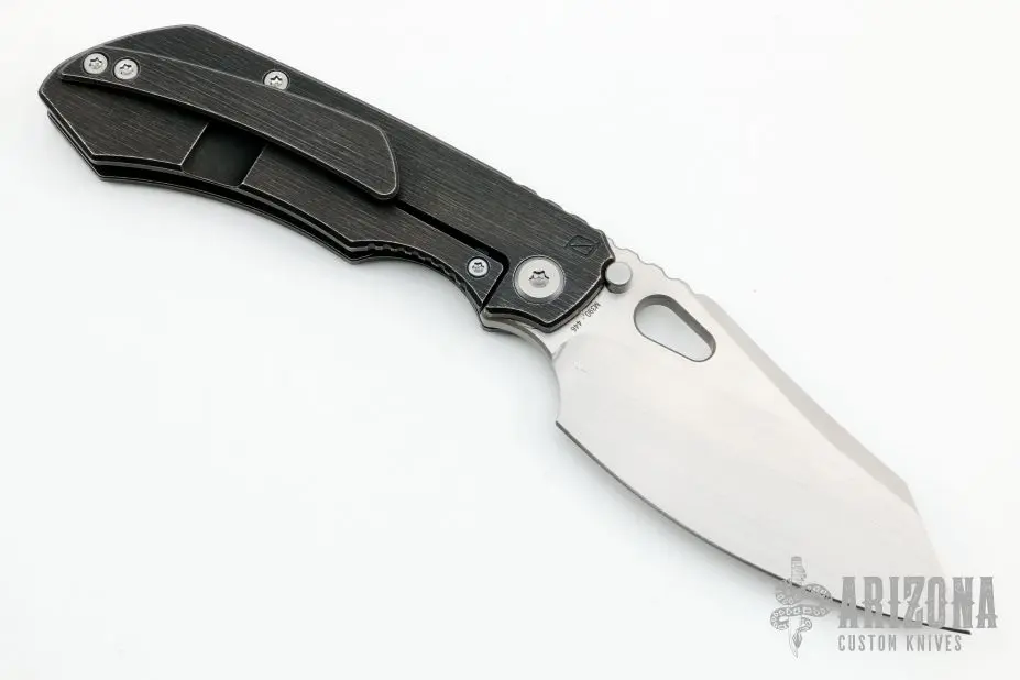 This Evolution 3.0 by Custom Knife Factory features a hand rub satin finished blade with notched thumbrest and thumbhole. The handle has a stonewashed bark finished titanium frame with a matching tip up clip and backspacer. ZircuTi pivot collar. Comes with velcro case and COA. Nice detent, lockup and blade seating. New condition. #446 and dated 8-22