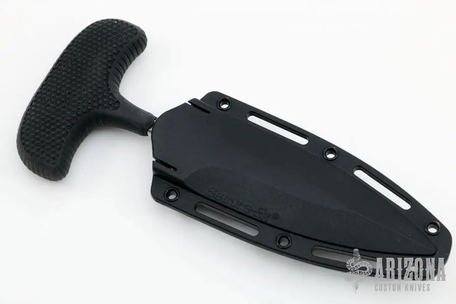 This Safe Maker I push dagger from Cold Steel has a satin finished chisel ground spear point blade with hollow ground backside and fuller on the front. Handle is non-slip. Excellent condition. Comes with a Secure-EX sheath with belt clip.