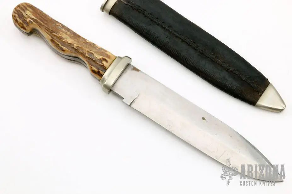 This Antique Bowie by Will & Finck features a spear point blade with a false top edge, .179″ blade stock and 1.465″ blade depth, full tang construction. The handle has a nickel silver guard and stag scales with brass pins. Comes with original nickel silver and black leather sheath. Has some scratches, patina, etc, good condition for its age. For such an old knife it has a lot going for it.Â
