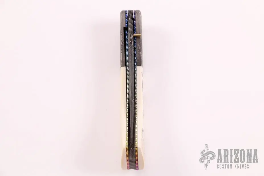 This knife by John Etzler features a Damascus blade with single gold thumbstud and fileworked blade spine. The handle has matching Damascus bolsters, mammoth ivory scales, fileworked and anodized titanium liners, fileworked Damascus backspacer. The scale was scrimshawed by “Tina” and dated “7-98”. Nice detent, lockup and blade seating. Excellent condition.