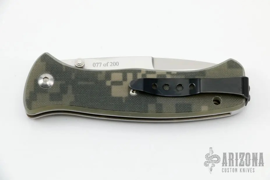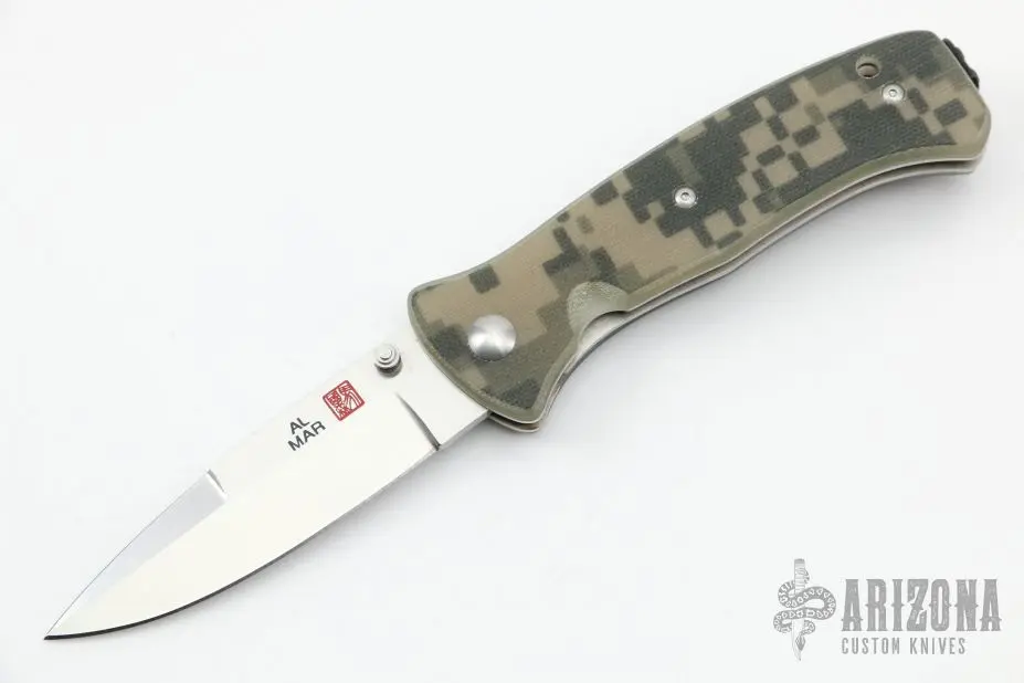 This SERE 2000 Linerlock Folder by Al Mar has a satin finish VG-10 stainless steel drop/ spear point blade with dual thumb studs. Handle is Digital Camo G10 over stainless steel liners, black stainless steel tip up clip, and lanyard hole. Comes with a zippered case. Excellent condition. #077 of 200