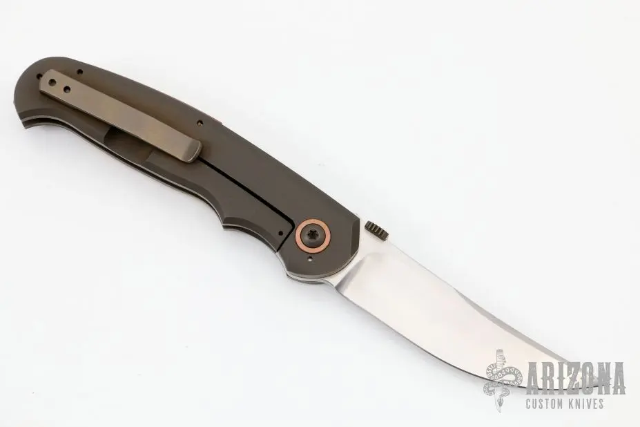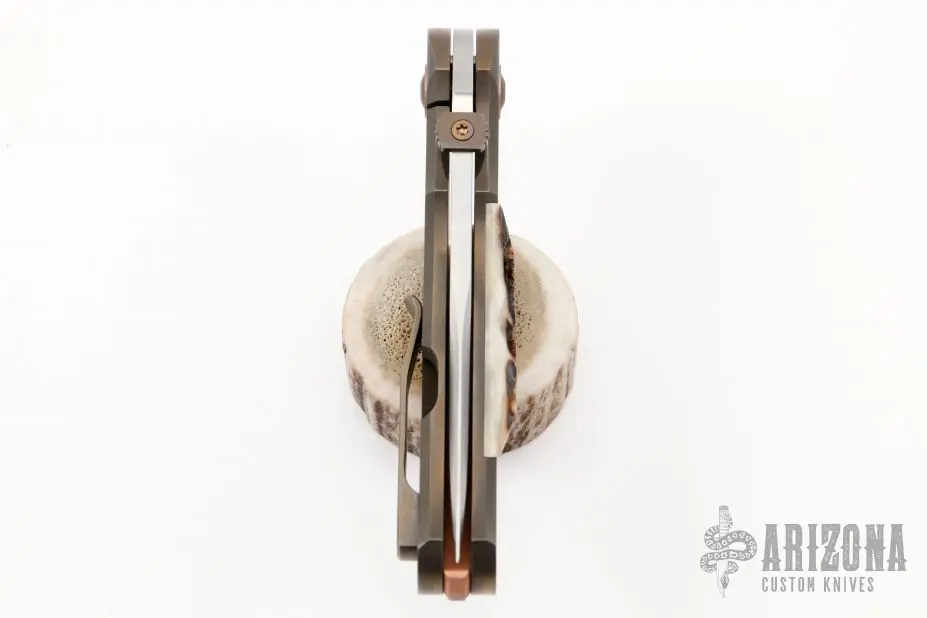 This Shakar Framelock by David Sharp features a hand rub satin finished blade with an anodized titanium thumbdisc. The handle has a bead blasted and anodized titanium frame, popcorn stag inlay, tip up anodized titanium clip and a copper backspacer and pivot collars. Nice detent, lockup and blade seating. Nice detent, lockup and blade seating. Excellent condition. Comes with a zippered case.