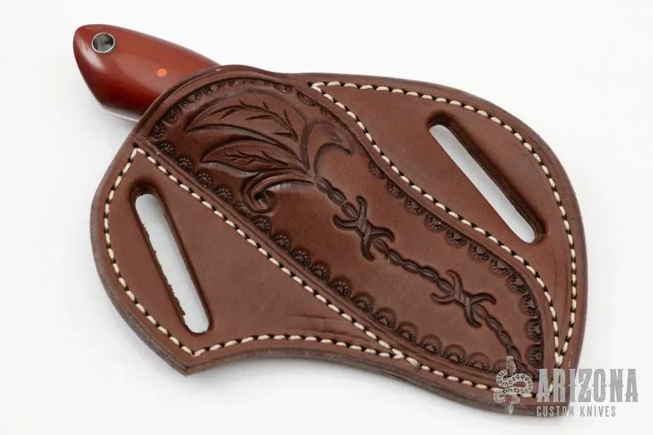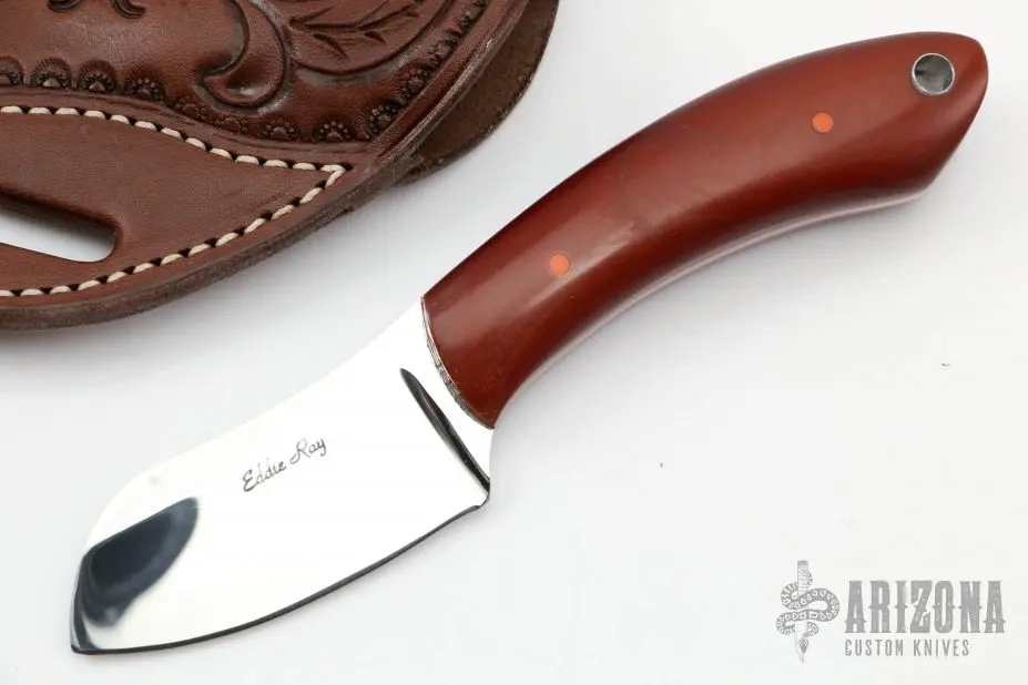 This knife by Eddie Ray features a mirror polished blade with .102″ blade stock and 1.174″ blade depth, full tang construction. The handle has vintage Westinghouse paper micarta scales with orange G-10 liners and natural canvas micarta pins. Comes with a hand tooled brown leather cross draw sheath. New from maker at the 2022 Blade Show.