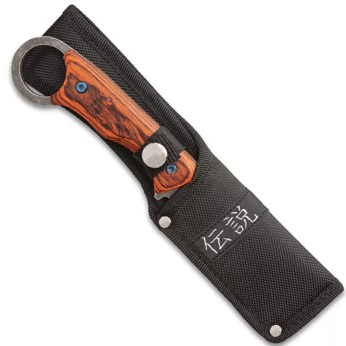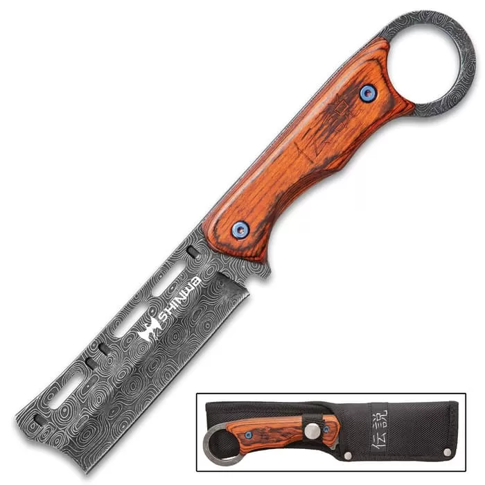 Illustrating the balance of two of earth’s most important resources, our Shinwa Bloodwood Cleaver Knife also feels perfectly balanced in your hand. It has a full-tang, black 3 1/10” 3Cr13 stainless steel blade with a unique raindrop finish and weight-reducing cut-outs. The reddish-brown, pakkawood handle scales are secured to the tang with heavy-duty screws and feature etched kanji. The fixed blade is 9” in overall length from open-ring pommel to cleaver tip and it fits securely in a tough, nylon belt sheath.