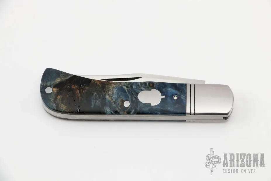 This Lanny’s Clip by Phil Jacob features a hand rub satin finished blade with nail nick. The handle has threaded stainless steel bolsters, blue poplar covers with a stainless steel escutcheon, stainless steel liners and spring. Â Has half-stop, flush in all positions. Â Comes with zippered case. Â New from Maker!Â