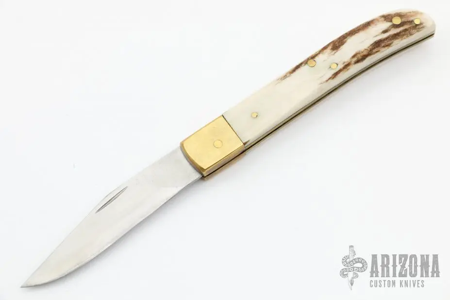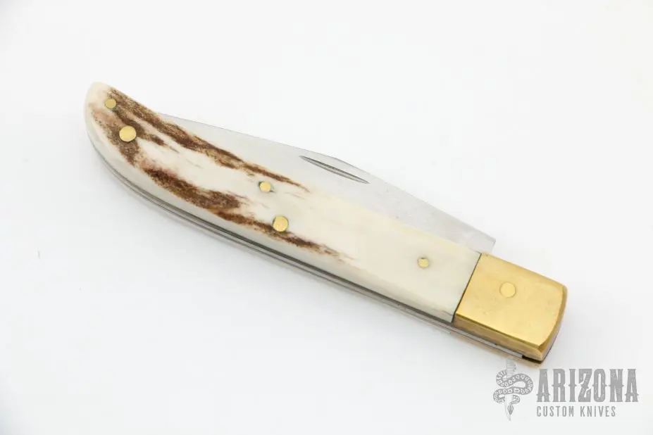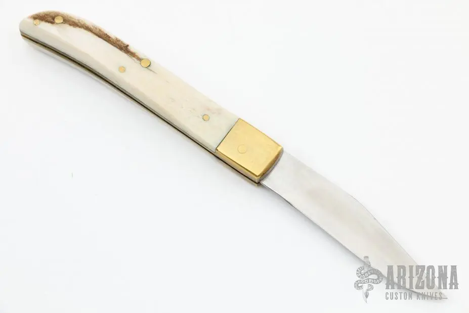 This Slipjoint by Larry Arnold features a clip point blade with nail nick. The handle is comprised of brass bolsters and elk antler covers over brass liners and steel backspring. Has some scratches, otherwise good condition.
