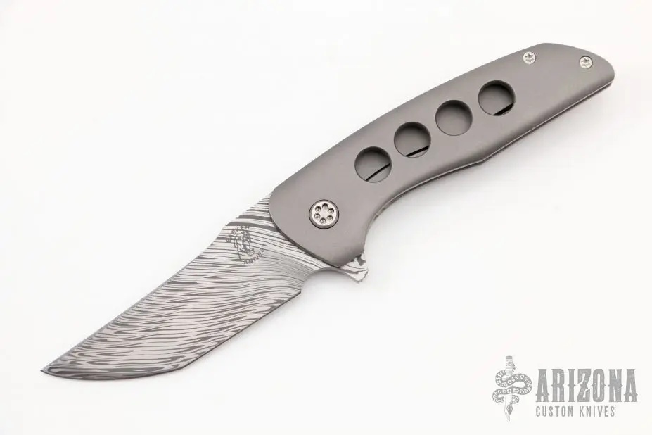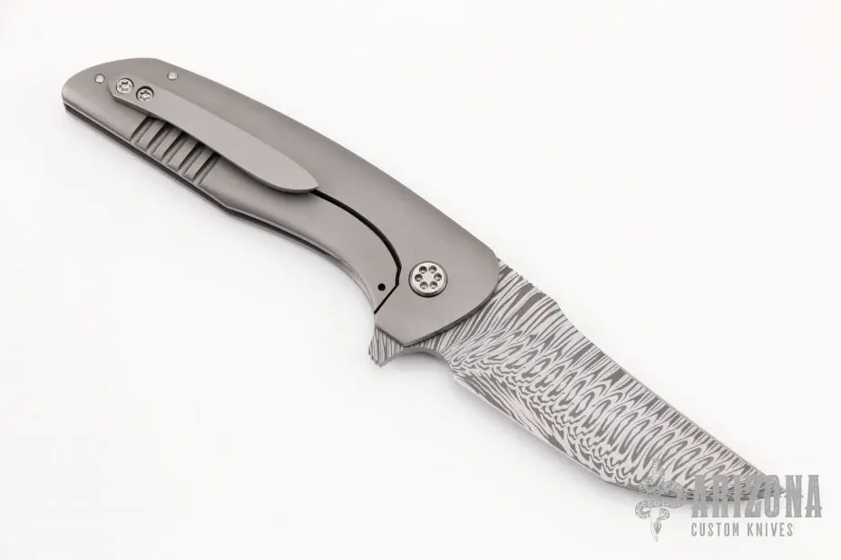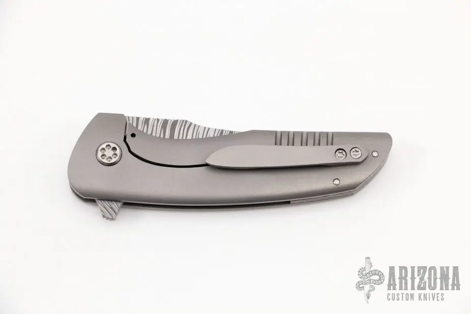 This Hokkaido by John Barker features Fafnir Damasteel blade with notched thumbrest and flipper. The handle has a bead blast finished titanium frame and tip up clip and a floating Damasteel backspacer. Rides on bearings, nice detent, lockup and blade seating. Comes with cloth pouch. New from maker at the 2022 CCKS.
