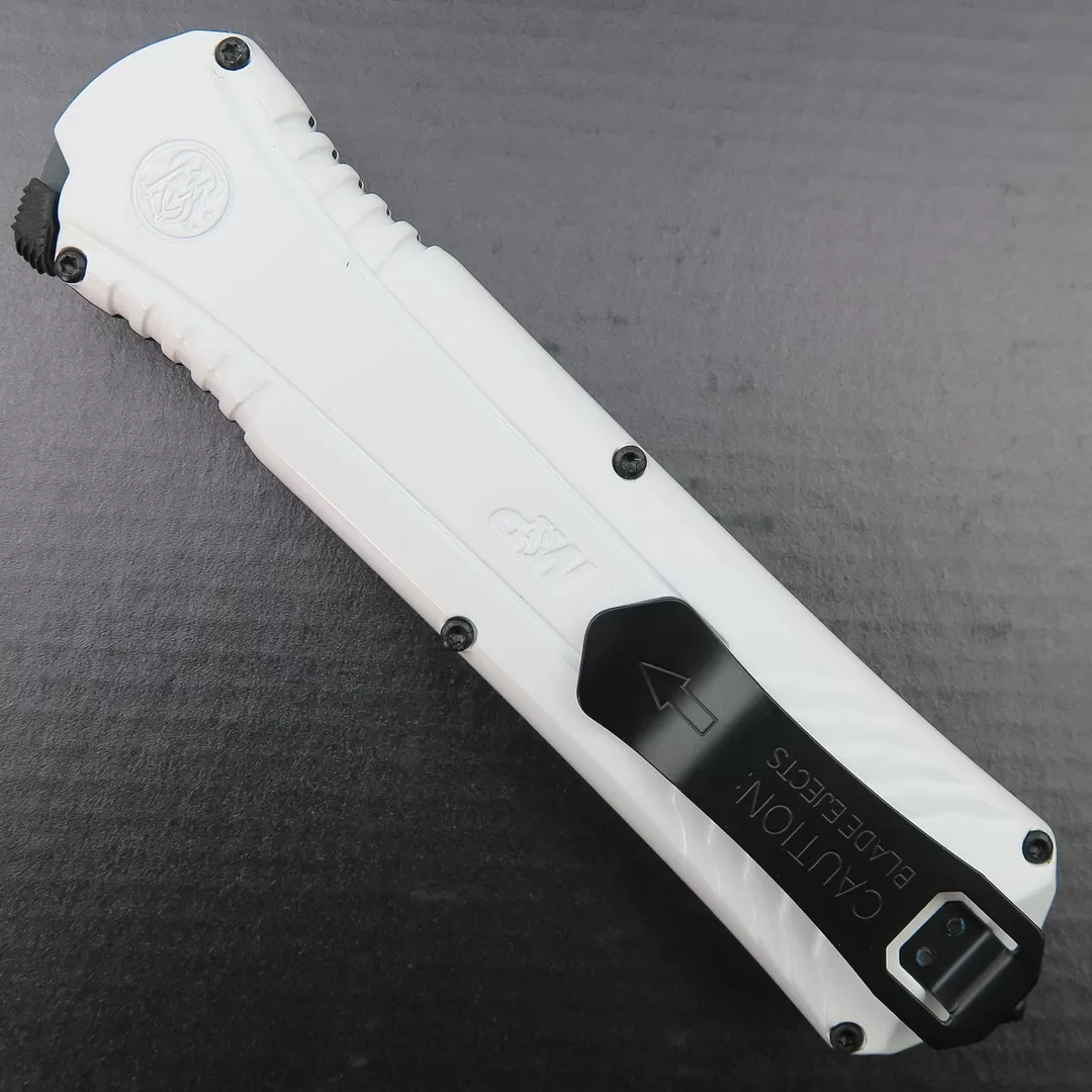This exclusive Smith & Wesson Military & Police out-the-front knife features a white handle, all-black hardware and a black finished tanto blade. This exclusive to BladeOps Storm Trooper edition is the classic M&P 10 OTF knife with an all white finish and black blade.