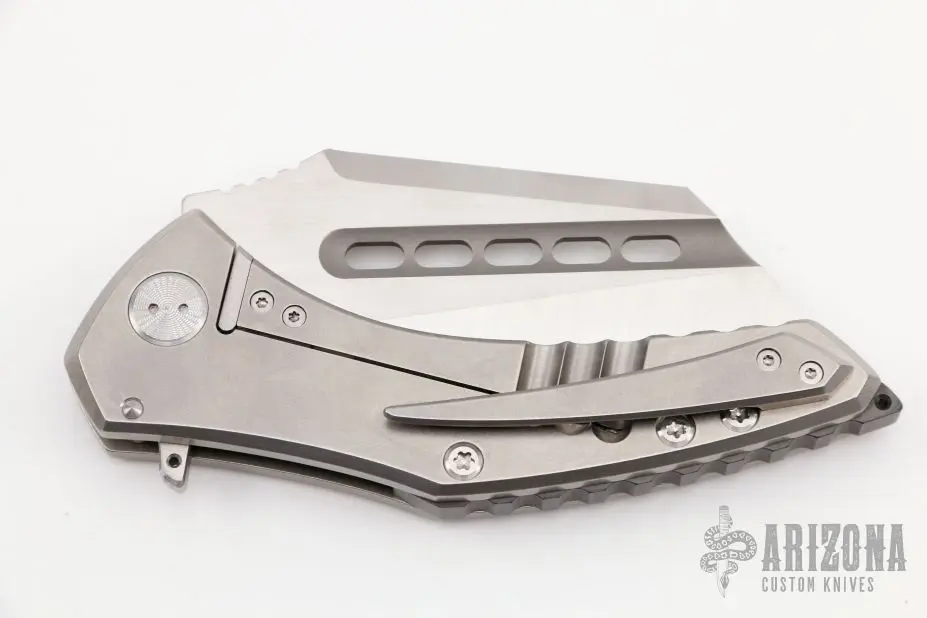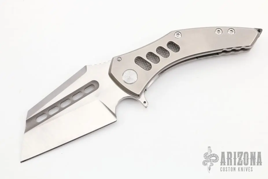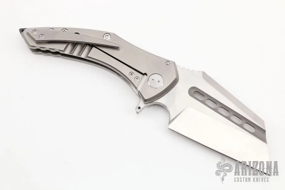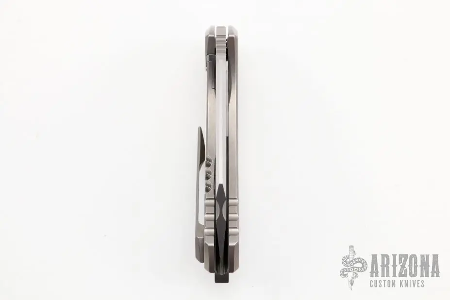This Spectre by Sergey Rogovets features a satin finished blade with fullers, notched thumbrest and flipper. The handle has a stonewashed titanium frame with mess underlay, zirconium backspacer, tip up stonewashed titanium clip. Excellent condition. Comes with original box and COA dated October 2019.