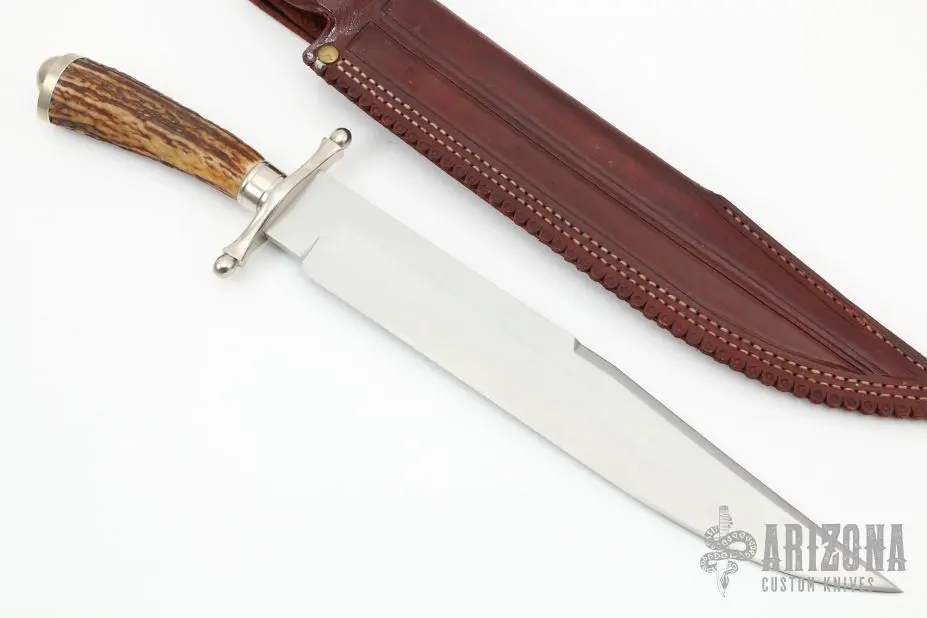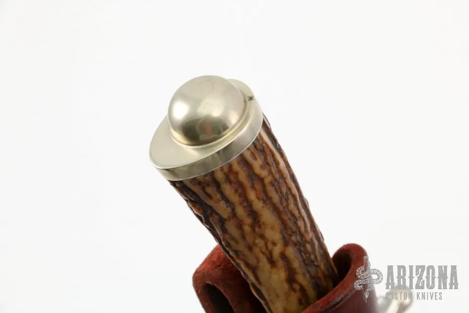 This Bowie by Chuck Roberts features a hand rub satin finished blade with a sharpened top, .249″ blade stock and 1.914″ blade depth, hidden tang construction. The handle has a nickle silver guard, stag grip, nickel silver spacer and butt. Comes with a hand tooled brown leather sheath. Excellent condition.