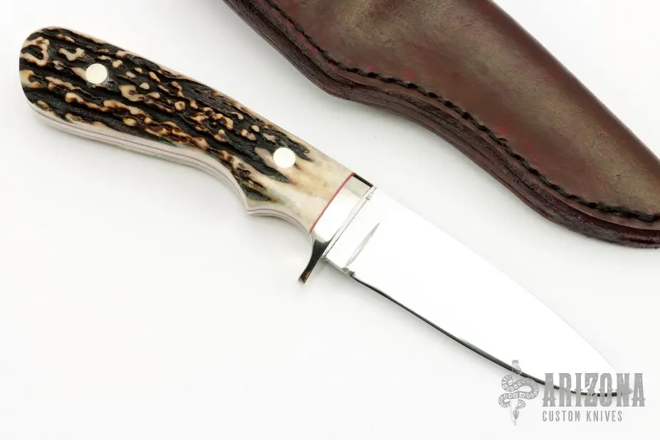 This drop point hunter by Phillip M Parris features a mirror polished blade with .130″ blade stock and 1.035″ blade depth, full tang construction. The handle has a nickel silver guard, stag scales with red liners and nickel silver pins. Comes with a maroon leather sheath. Excellent condition.