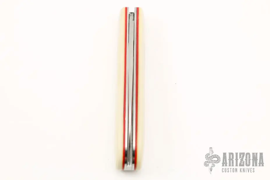 This Swayback Slipjoint by Rick Nowland features a wharncliffe blade with hand rub satin finish and nail nick. The handle Westinghouse ivory paper micarta covers with red liners and a stainless steel escutcheon, stainless steel liners and spring. Has half-stop. New from maker at the 2022 Blade Show Texas. Includes a zippered case.
