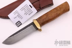 This Hunter by Murad Custom Knives features a drop point blade with nice hamon and forge finished flats, .243″ blade stock and 1.175″ blade depth, hidden tang construction. The handle has a textured brass guard and a teak burl wood grip. Comes with a brown leather sheath and COA. New from maker.