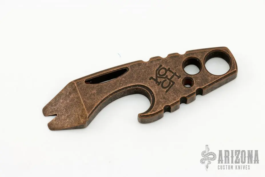This Kap Lifter by Justin Koch features copper construction with an antiqued finish. It features a pry tip with nail puller notch and bottle opener. Excellent condition. .252″ thick.