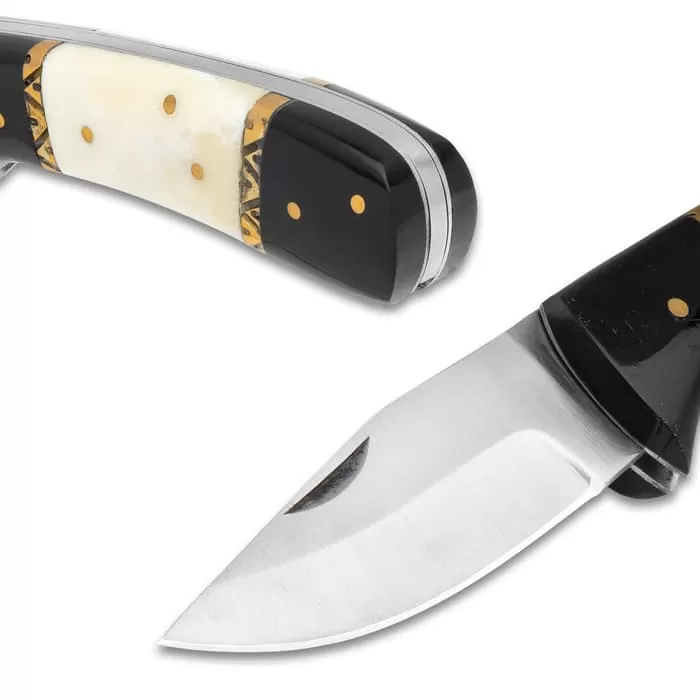 Timber Wolf has a legacy of producing knives that are classically attractive and functionally exceptional. The Timber Wolf Dodge City Pocket Knife is a perfect specimen. The stainless steel, drop point blade is keenly sharp and can be easily opened with a nail nick. The sleek and smooth handle is crafted of two black bone panels flanking a cream-colored bone panel, separated by brass fileworked bands, and secured with brass pins. A belt sheath comes with the pocket knife for ease of carry.
