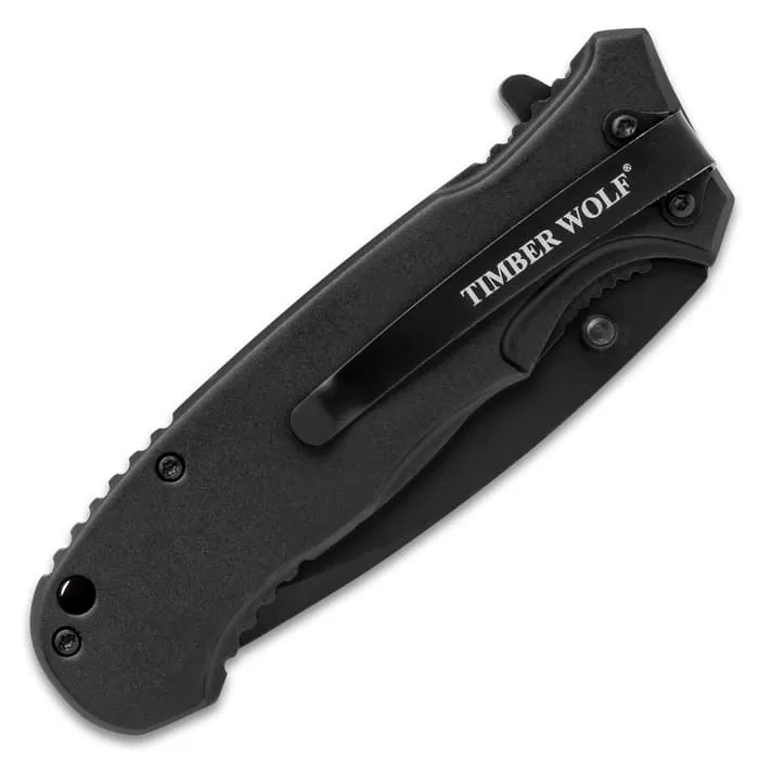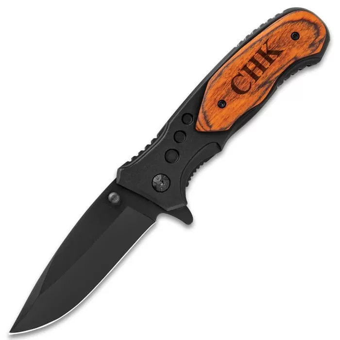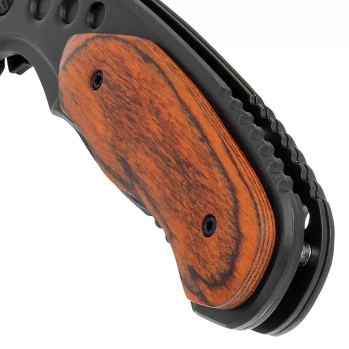 A modern uptake on the classic everyday carry pocket knife, the Timber Wolf Expedition Pocket Knife is up for any adventure to go on. The drop point blade is non-reflective blade and comes sharp and ready right from the start. The blade can be easily deployed with either of its thumbstuds to access the assisted opening mechanism. The handle is black aluminum with brown Pakkawood handle scales, which are the perfect canvas for engraving initials or a name.