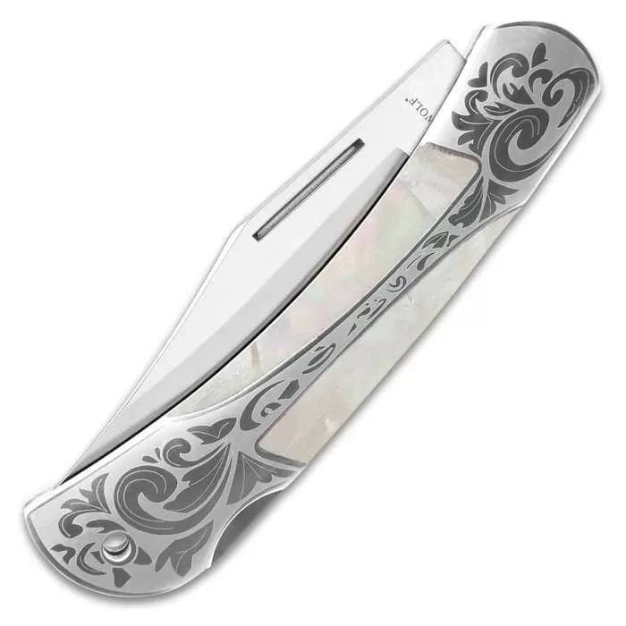A smooth, elegant design combined with rugged functionality; this Gentleman’s Genuine Pearl Pocket Knife from Timber Wolf makes the perfect everyday carry for that someone special in your life. The knife is equipped with a polished 3 1/4” razor-sharp, stainless steel clip point blade with a nail nick for ease of opening. The custom handle features genuine pearl inlays and the nickel silver bolsters with intricate scroll designs complete the design. The elegant lock back pocket knife is 7 1/2″ in overall length and 4 1/4”, when closed.