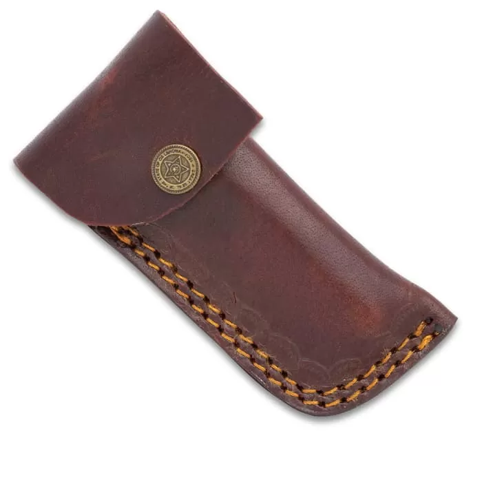The Timber Wolf Renegade is a good, solid workhorse EDC pocket knife. The blade is a tough, Damascus steel with a razor-sharp edge that will easily cut through any task and look good doing it. The premium wooden handle scales are contoured so that the knife fits comfortably in your hand the handle features attractive filework on the back. Carrying the pocket knife easily at your side in its snap top leather belt sheath.