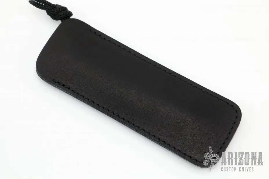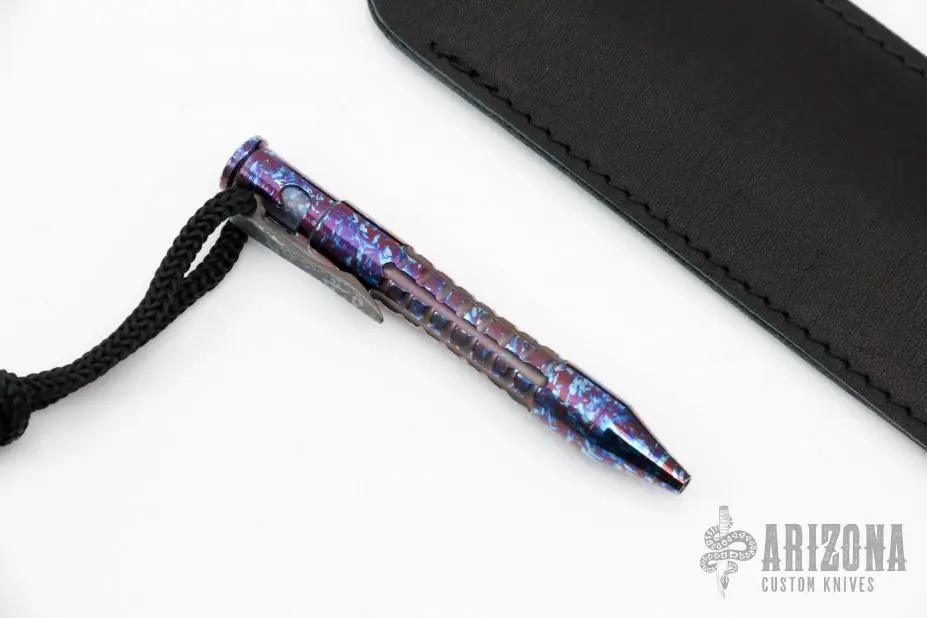 Anodized Titanium Bolt Action Style Pen by Max Knives. The clip is the bolt, push it down and over to deploy the pen. Comes with a black leather slip sheath. New from maker at the 2022 Blade Show.