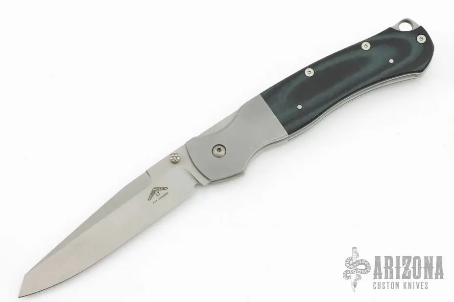 This Top Lock folder by Warren Osborne features a bead blast finish blade with dual checkered thumbstuds. The handle has bead blasted stainless steel bolsters with integral liners, black/green G-10 scales, stainless steel locking liner and backspacer. Numbered 004 on black of blade. Bead blasted tip down steel pocket clip. Excellent Condition. Very cool locking mechanism, its an early compression lock. Comes with a zippered case.