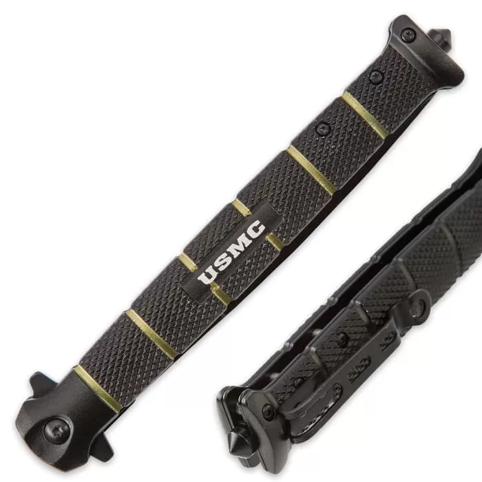 An undeniably modern take on a classic folding knife design, the officially licensed USMC “Blackout” Stiletto combines all the wicked ferocity of the iconic stiletto with contemporary tactical appointments and styling. And this impressively supersized “Colossal” version packs even more punch than the original USMC Blackout Combat Stiletto, with its menacingly enlarged blade and beefed up overall dimensions! Its potent 5″ 420 stainless steel blade features the sleek spear point profile that old-school stiletto fans know and love and adds a distinctive blood groove and bold nonreflective black coating. Beautifully offsetting the blade’s matte black finish, the famous USMC seal is carefully laser etched in white next to the razor sharp edge, flanked by the branch’s illustrious, well-earned slogan – “Marines: The Few. The Proud.” The chic blade deploys with incredible speed, thanks to the Colossal Blackout Stiletto’s silky smooth assisted opening mechanism – easily triggered with the handy flipper. Cast from an advanced aluminum alloy, the handle is encircled by five green bands – an aesthetic nod to the historic USMC combat fighter knife and its legendary stacked leather handle. Engineered to satisfy the unique tactical demands and survival challenges of the modern era, the Colossal Blackout Stiletto’s handle is extraordinarily durable yet lightweight, boasting an elegant diamond gun stock texture that virtually eliminates slippage, even in wet, muddy environments and other harsh conditions. “USMC” is laser etched at the handle’s center, reminding all who see it that the Colossal Blackout Stiletto is built “Marine tough.” Set at the base of the handle is a convenient steel glass breaker – another contemporary feature that’s perfect for escaping (or assisting others in escaping) entrapment in a wrecked vehicle or burning building, where glass windows are the only means of exit. Add the built-in steel pocket clip, and you’ve got an outstanding, extra-large assisted opening folder that honors traditional wisdom, while taking full advantage of the latest and greatest innovations. And since it’s officially licensed by the United States Marine Corps, you can rest assured the USMC Colossal Blackout Stiletto is in it for the long haul – a stout pocket knife you can rely on, come what may, just like a US Marine.
