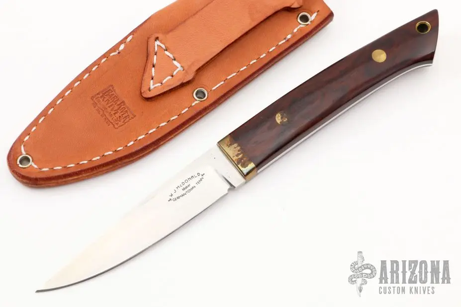 This hunter by WJ McDonald features a satin finished blade with a tapered tang construction. Â .127″ Blade Stock. Â .808″ Blade Depth. Â The handle features a brass guard and wood scales. Â Includes a Bark River leather sheath that fits the knife nicely. Â Heavy patina is visible on the brass otherwise the knife is in good condition. Â