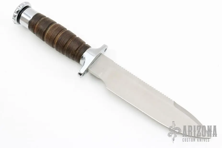 This Survival knife by Hackman features a spear point blade with sawteeth on the spine, .234″ blade stock and 1.534″ blade depth, hidden tang construction. The handle has a stainless guard, stacked leather hollow handle and removable stainless butt cap, has storage area in handle. Has some scratches, otherwise excellent  condition.Â