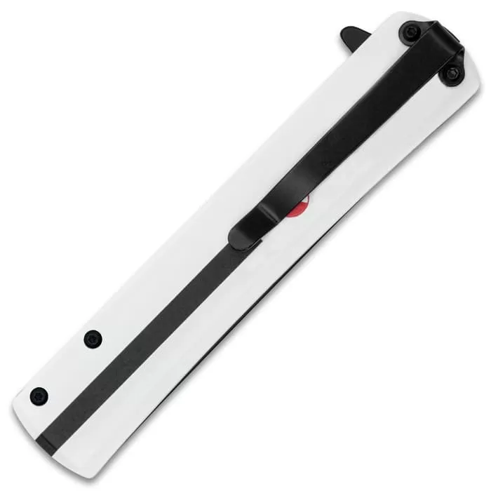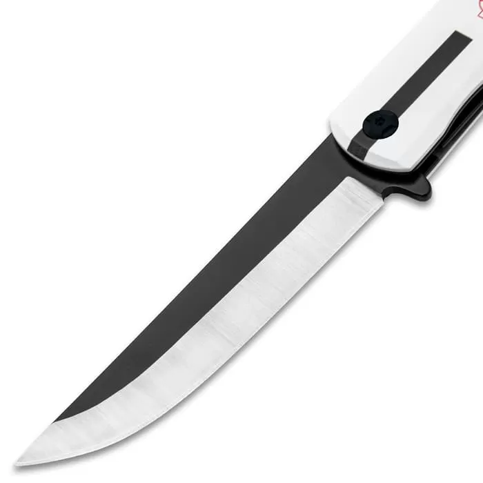If anime and manga is your jam, the White Anime Assisted Opening Pocket Knife is just for you! The slim and sleek piece has the look and feel of a knife pulled from the pages of manga or from anime shows that you love. It’s a pocket knife that one of your favorite characters would carry with its sharp, two-toned premium stainless steel blade and flipper for quick and easy deployment. The white aluminum handle has the red and black artwork that gives it the familiar look of the animated and graphic novel environment. When fully open, this pocket knife is 9” overall and it fits comfortably in your pocket at 5” closed or attached to it with the pocket clip.