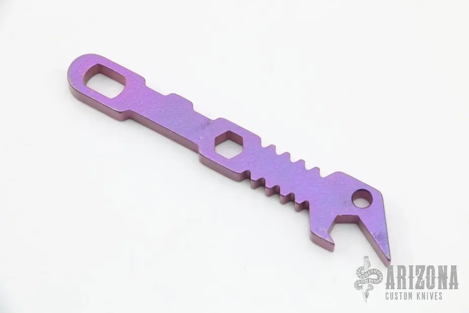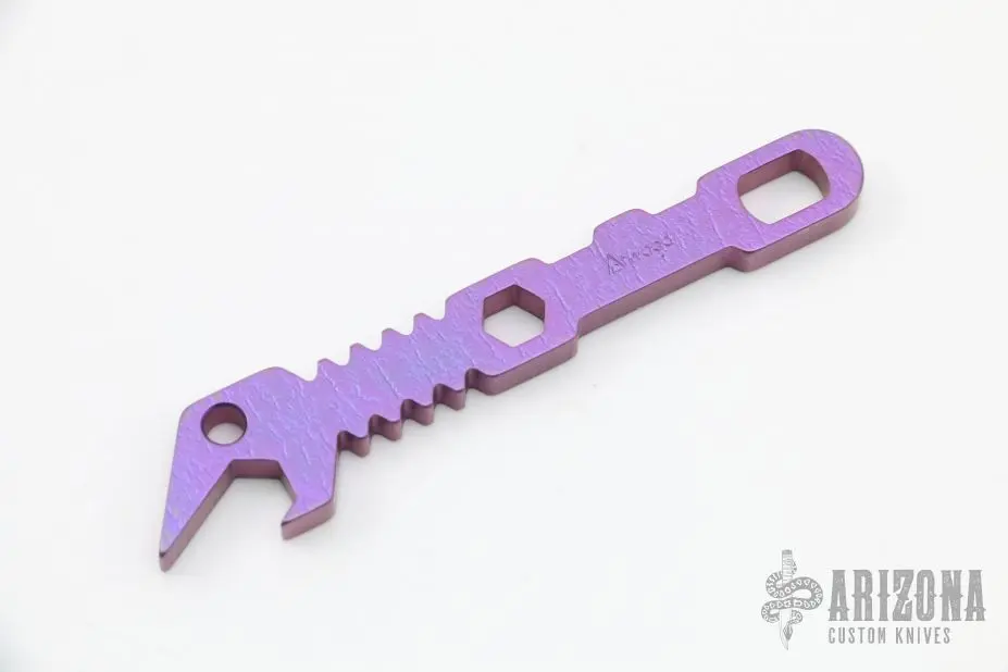 Atwood Wiener Dogs, part of the Little Jimmy Series, are made from exclusive crinkle textures titanium. Â Features include a small push/pry tip, 1/4″ hex opening, and o2 wrench which doubles as a lanyard opening. Â Also, a cap lifter, XL screwdriver/pry and 5/16 wrench. Â These slim pry bars make an elegant key fob with plenty of interesting grip surfaces for your fidgety fingers. Â Excellent Condition. Â