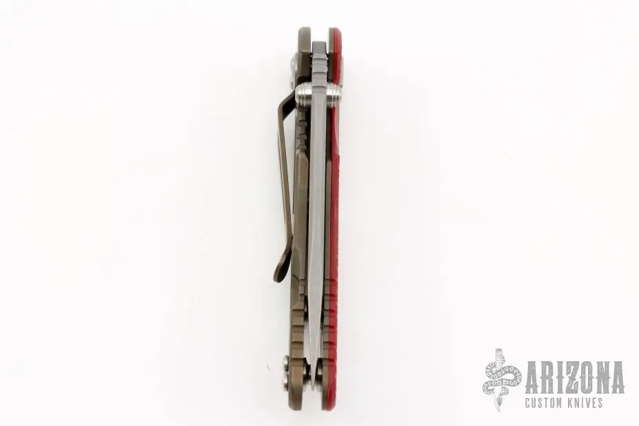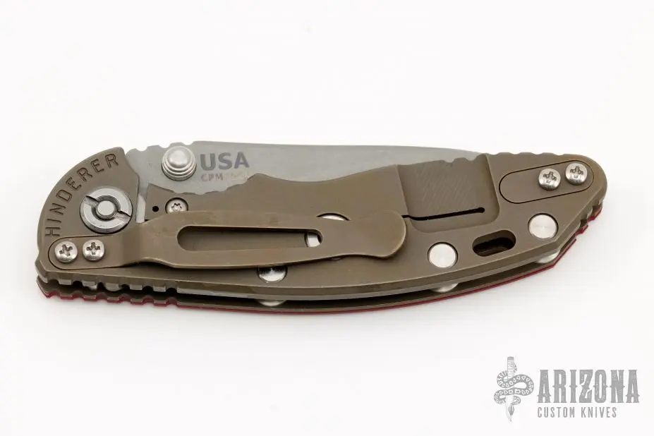 This 3″ XM-18 Slicer by Rick Hinderer Knives features a working finished drop point blade with swedge, dual thumb studs and notched thumbrest. The handle has a textured red  G10 scale over battle bronze titanium liner and frame with matching filler tab and pocket clip. Includes original box, papers and extra hardware. New condition.