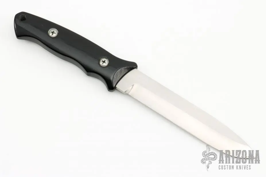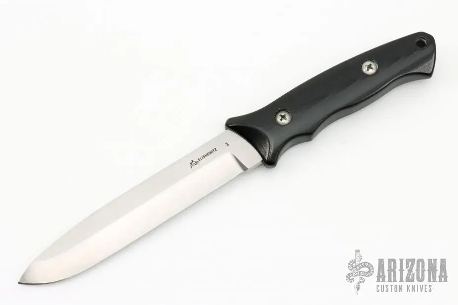 This Y2K knife by Allen Elishewitz features a hand rub satin finished blade with .200″ blade stock and 1.017″ blade depth, hidden/mortise tang construction. The handle is black G-10. Has a few light scratches, otherwise excellent condition.